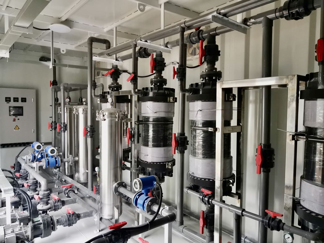DD-OD主要分為道南滲析(DD)和滲透蒸餾(OD)兩個(gè)部分。道南滲析以驅(qū)動(dòng)離子(Na+)和目標(biāo)離子(NH4+)的濃度差為驅(qū)動(dòng)力,使銨離子通過(guò)陽(yáng)離子交換膜進(jìn)入高pH的接收室,同時(shí)將氨素轉(zhuǎn)化為NH4+形式;在滲透蒸餾部分,高堿度使接收室中的NH3快速逃逸,通過(guò)疏水透氣膜進(jìn)入酸室并恢復(fù)至NH4+形態(tài),最終以高純度銨鹽的形式獲得產(chǎn)物,用于下游使用。工藝包括原水單元、堿液驅(qū)動(dòng)單元、酸液回收單元、膜清洗單元、自動(dòng)化控制及儀表電氣單元。氨氮去除率達(dá)80%,回收率達(dá)90%。通過(guò)高中濃度堿驅(qū)動(dòng)高效離子分離耦合氣態(tài)回收過(guò)程,無(wú)需外加能源,節(jié)能降耗,實(shí)現(xiàn)近“零能耗”氨氮資源回收;通過(guò)離子交換膜-透氣疏水膜雙膜耦合抗污,解決透氣疏水膜易污染、易堵塞難題,減少膜更換頻率、降低成本;過(guò)程無(wú)副反應(yīng),無(wú)二次污染,且回收的硫酸銨溶液可作為優(yōu)質(zhì)氮肥原材料,實(shí)現(xiàn)資源化閉環(huán)。適用于各類氨氮廢水。