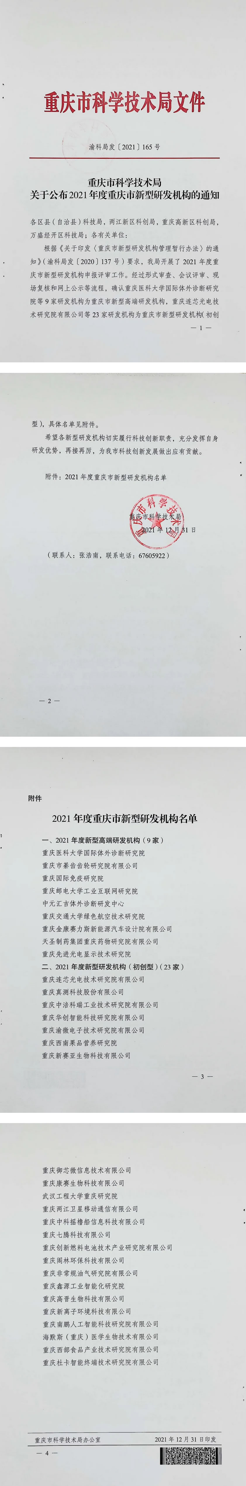 經(jīng)過自主申報、形式審查、會議評審、現(xiàn)場復(fù)核和網(wǎng)上公示等流程,我司在2021年的最后一天獲評重慶市新型研發(fā)機構(gòu)(初創(chuàng)型),離不開社會各界的支持,在此統(tǒng)一表示真心的感謝!