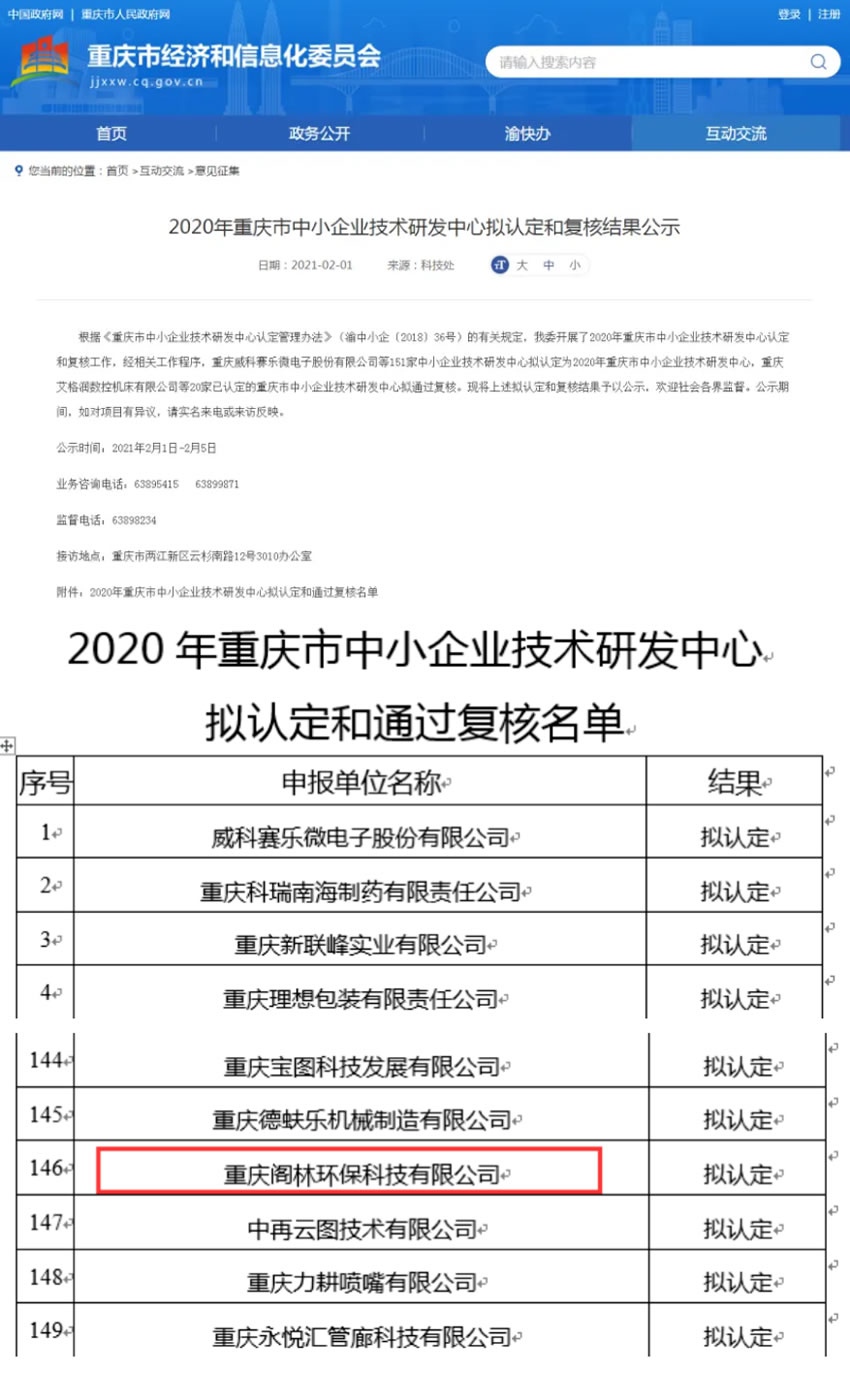此次順利通過中小企業技術研發中心的認定是國家對閣林環保的研發實力、研發成果、投產能力的高度認可,標志著重慶閣林環保的自主創新能力和核心競爭力實現了新的突破,能為重慶市中小企業的技術創新起到示范帶頭作用。