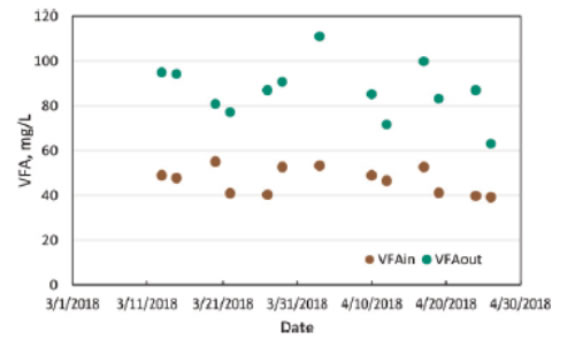 圖2 生產規模初級污泥發酵中的VFA進出,顯示平均增加40 mg-VFA/L [VFA出 -VFA入],溫度16–18°C,NH4-N和磷的凈釋放量分別為2和1 mg/L。