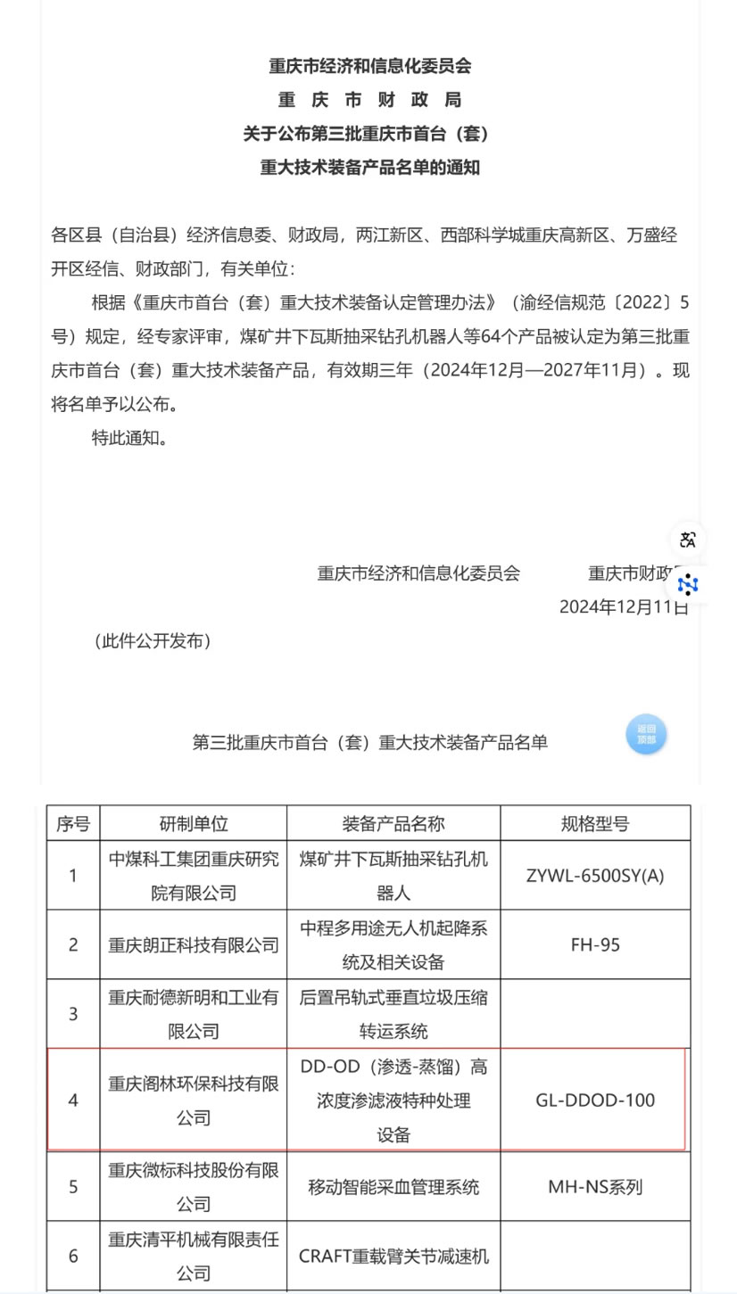 - 喜訊 | 我司“DD-OD(滲透-蒸餾)高濃度滲濾液特種處理設(shè)備”入選第三批重慶市首臺(tái)(套)重大技術(shù)裝備產(chǎn)品名單!