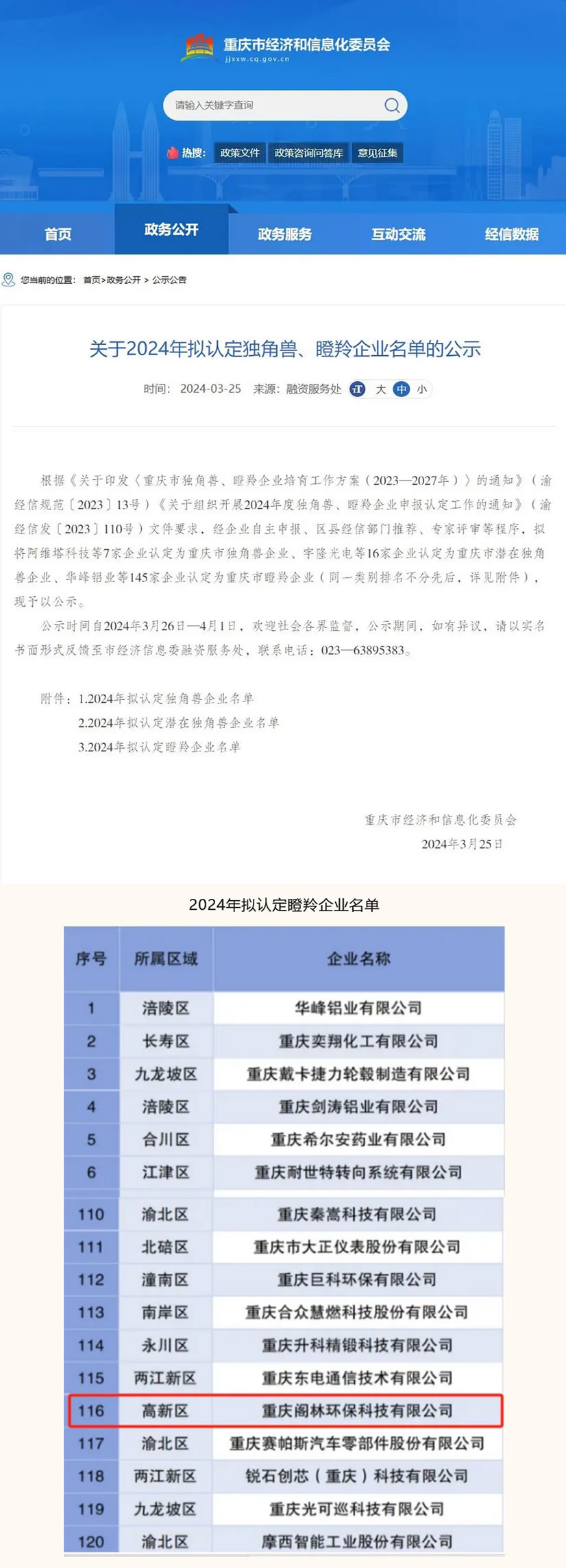 近日,重慶市經(jīng)濟(jì)信息委發(fā)布2024年度市級獨角獸及瞪羚企業(yè)評選認(rèn)定公示名單,重慶閣林環(huán)保科技有限公司(以下簡稱“閣林環(huán)保”)榮獲2024年度重慶市“瞪羚企業(yè)”稱號。