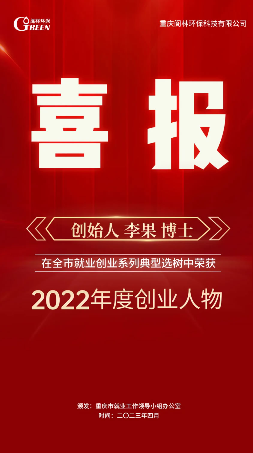 - 喜訊 | 閣林環(huán)保創(chuàng)始人李果博士榮獲“重慶市2022年度創(chuàng)業(yè)人物”!