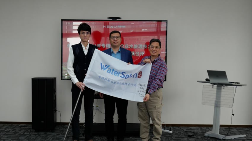 活動最后,合續科技副總裁張健民,閣林環保工藝工程師徐君,沙龍秘書長、北水教育總經理冀廣鵬同時登臺,完成交旗儀式。